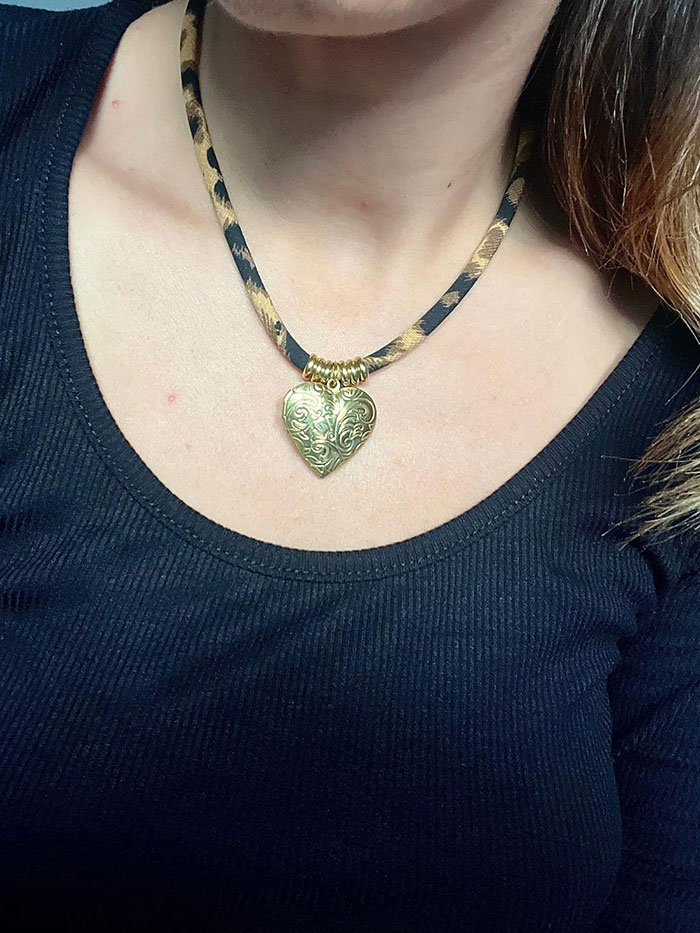 Le Collier Amore est un collier audacieux associe une corde recouverte d’un imprimé léopard chic à un grand pendentif en forme de cœur qui s’ouvre en acier inoxydable doré. L’alliance du motif animal et du doré lumineux crée une pièce forte et tendance, idéale pour affirmer votre style.