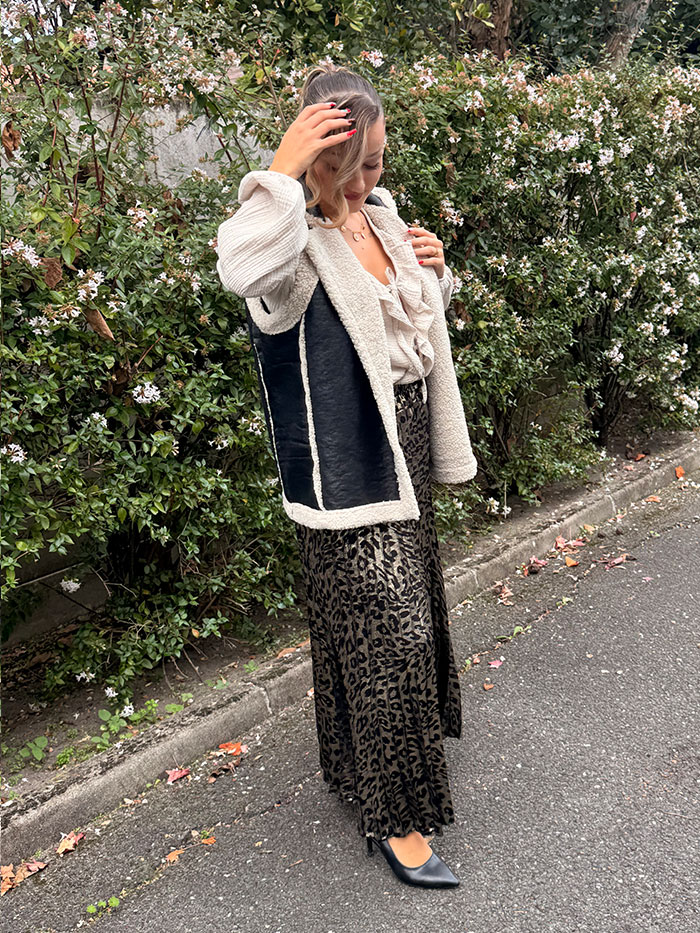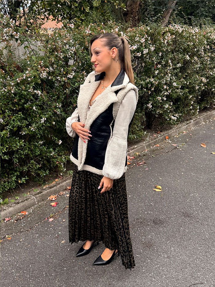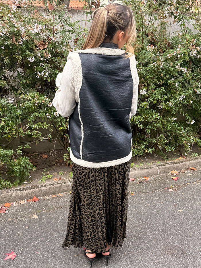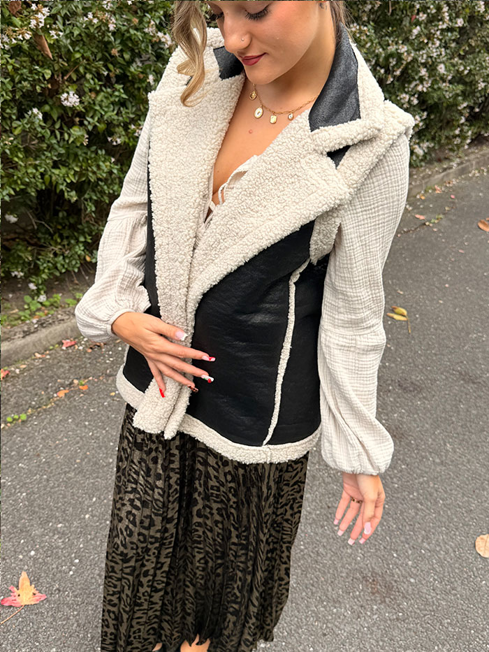 Le Gilet Charly est le gilet de la saison. Pour un look mode et tendance, il est indispensable pour parfaire vos tenues quotidiennes et de soirées. Son effet mouton retourné Sherpa, donnera une touche bohème chic.