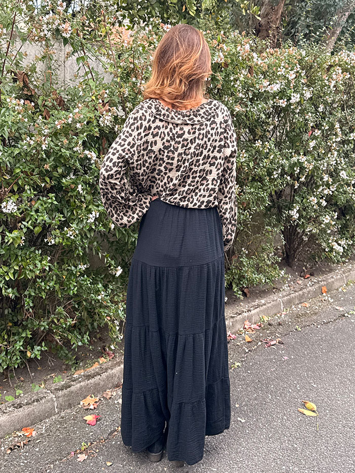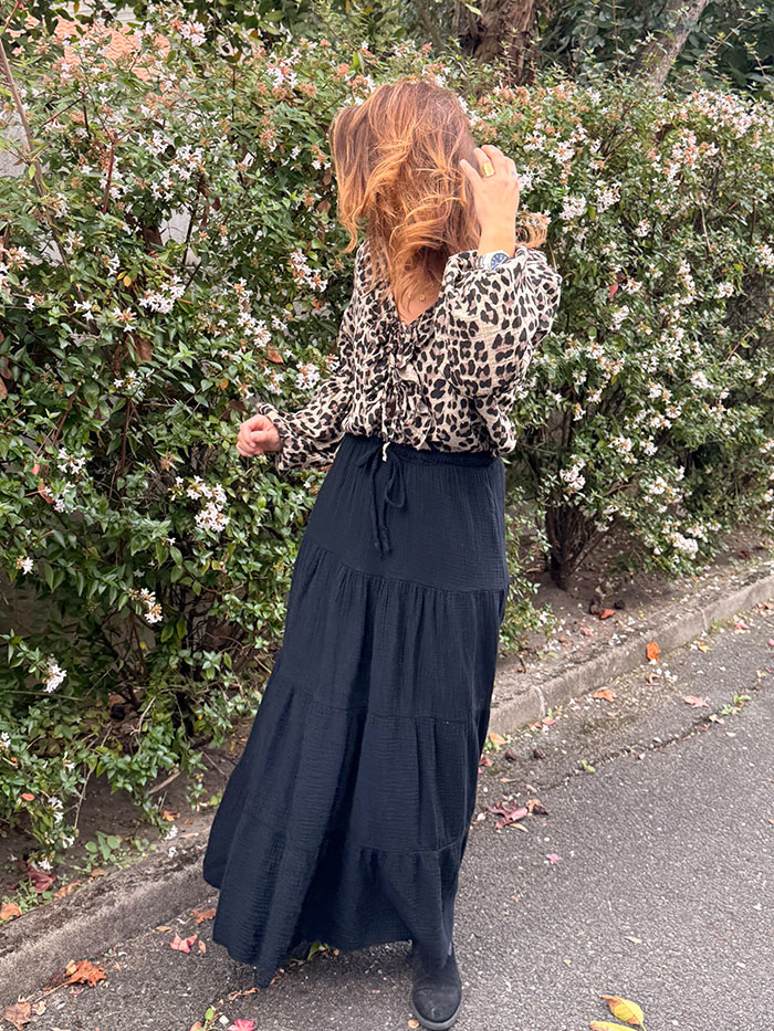 La Jupe Sora de couleur noire, est une jupe en gaz de coton longue, avec un élastique à la taille. Idéale en toutes circonstances, elle est la pièce indispensable à votre dressing.