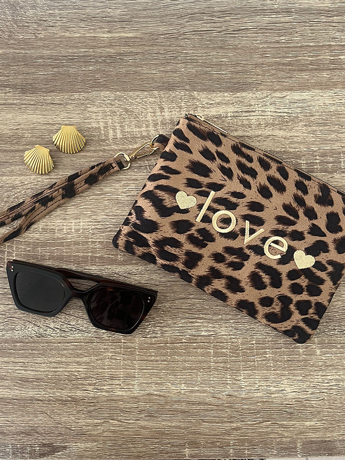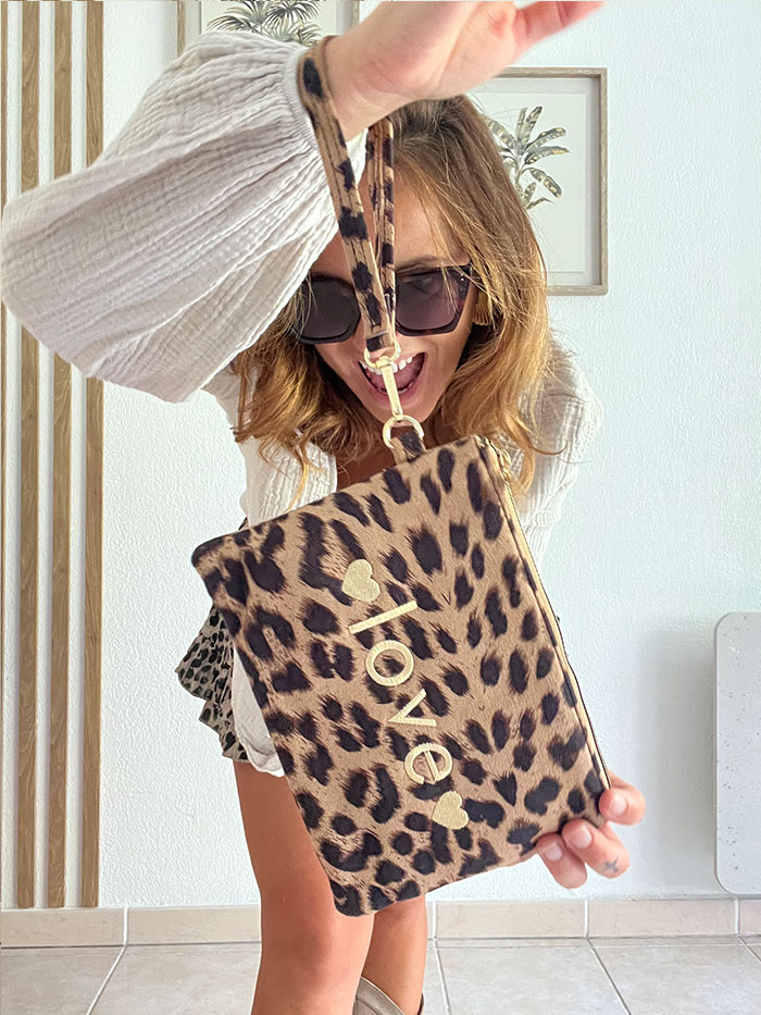 La pochette Love, imprimée léopard, est la pochette indispensable. Elle vient accompagner une look Léo ou alors donner du contraste à un look monochrome. Son écriture Love en doré, avec des jolis coeurs donne une note Girly.