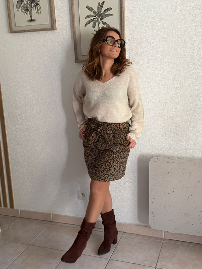 Le pull Callie de couleur beige est un pull col en V. Des étoiles léopard entourées de doré viennent parfaire ce pull sur chaque manche au niveau des coudes.