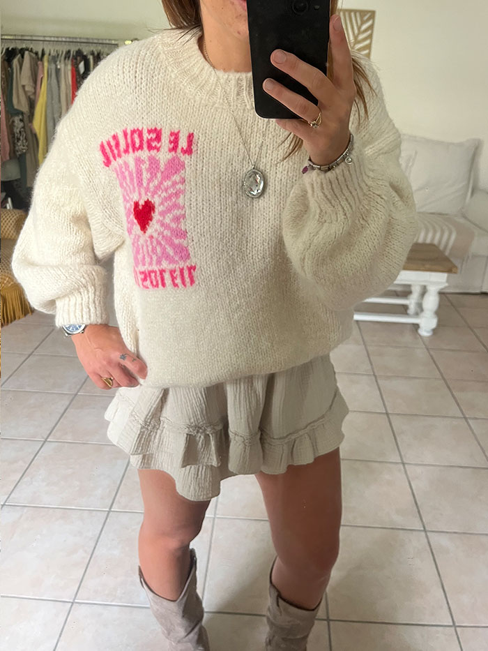 Le Pull Soleil est le pull de la saison, c’est un indispensable pour parfaire vos tenues. Avec son motif Soleil Coeur, en petit à l’avant et en grand dans le dos, vous aurez un Look ultra TENDANCE. Il s’adapte à toute les morphologies.
