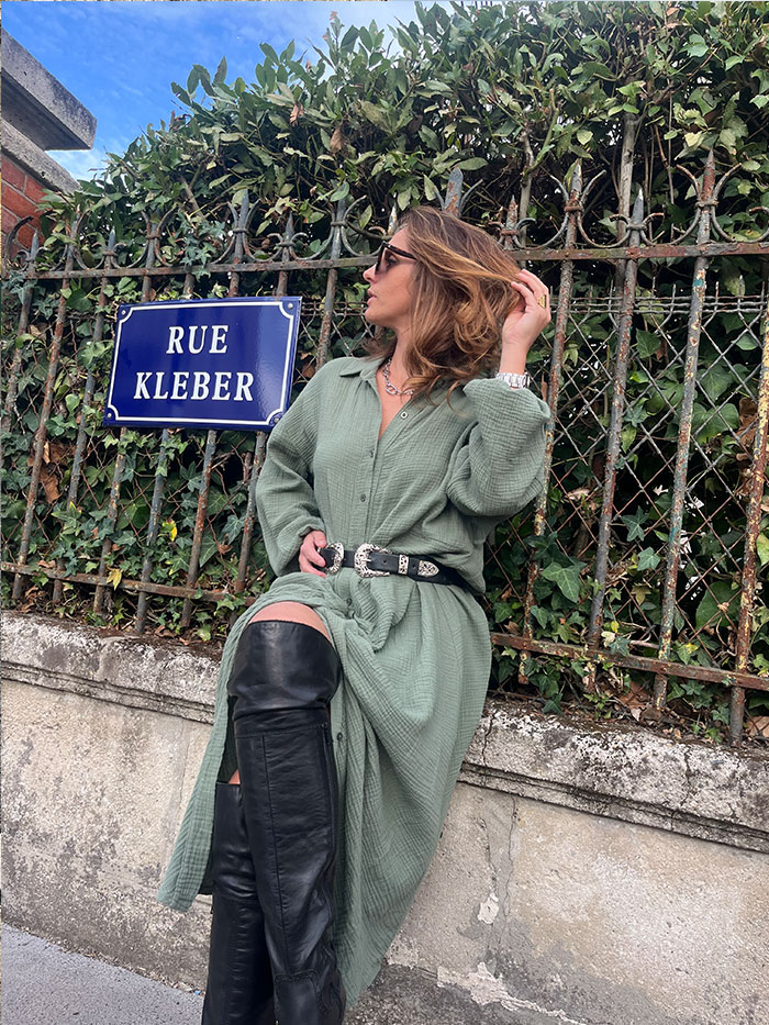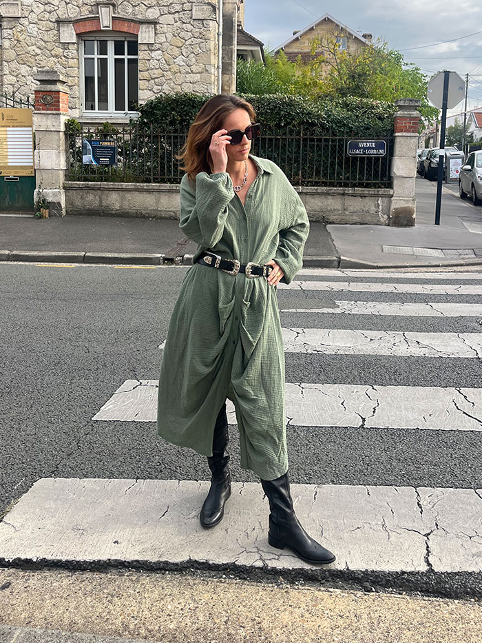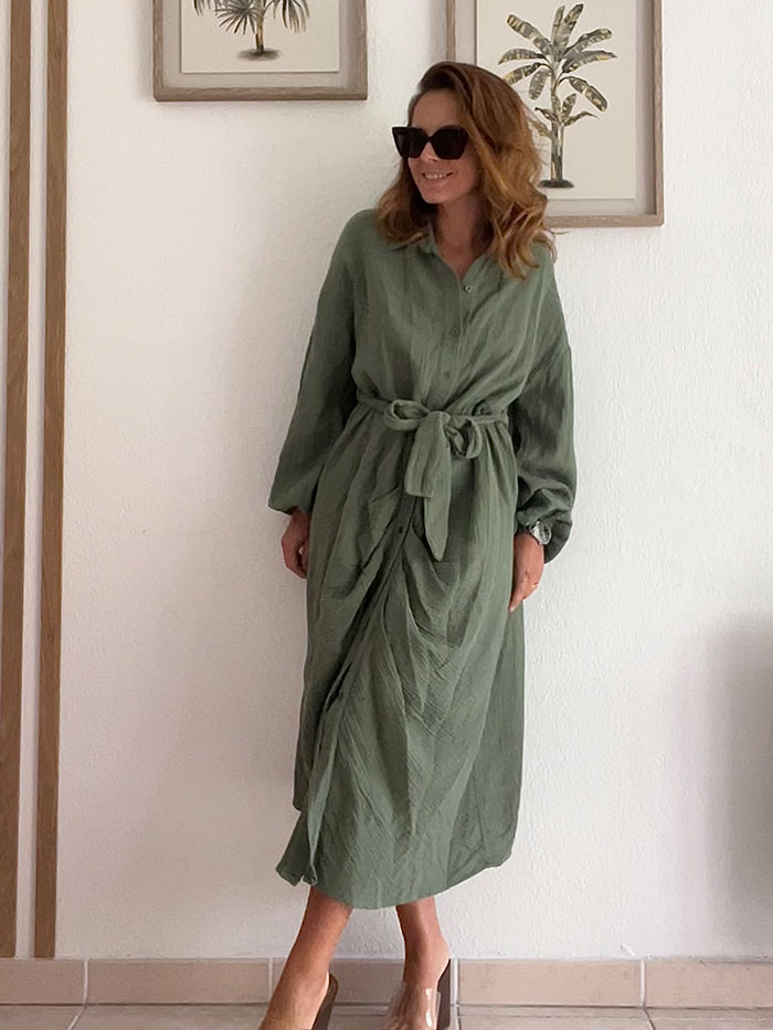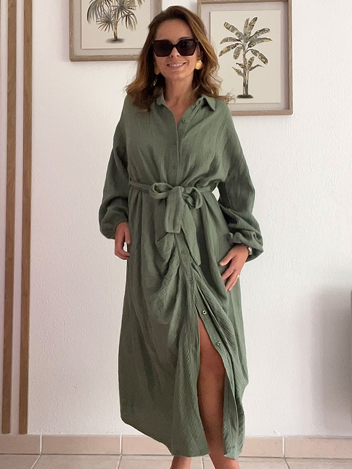 La robe Gala, couleur Kaki, est une robe chemisier en gaz de coton. Grâce à sa ceinture à nouer, elle s’adapte à toutes les morphologies.